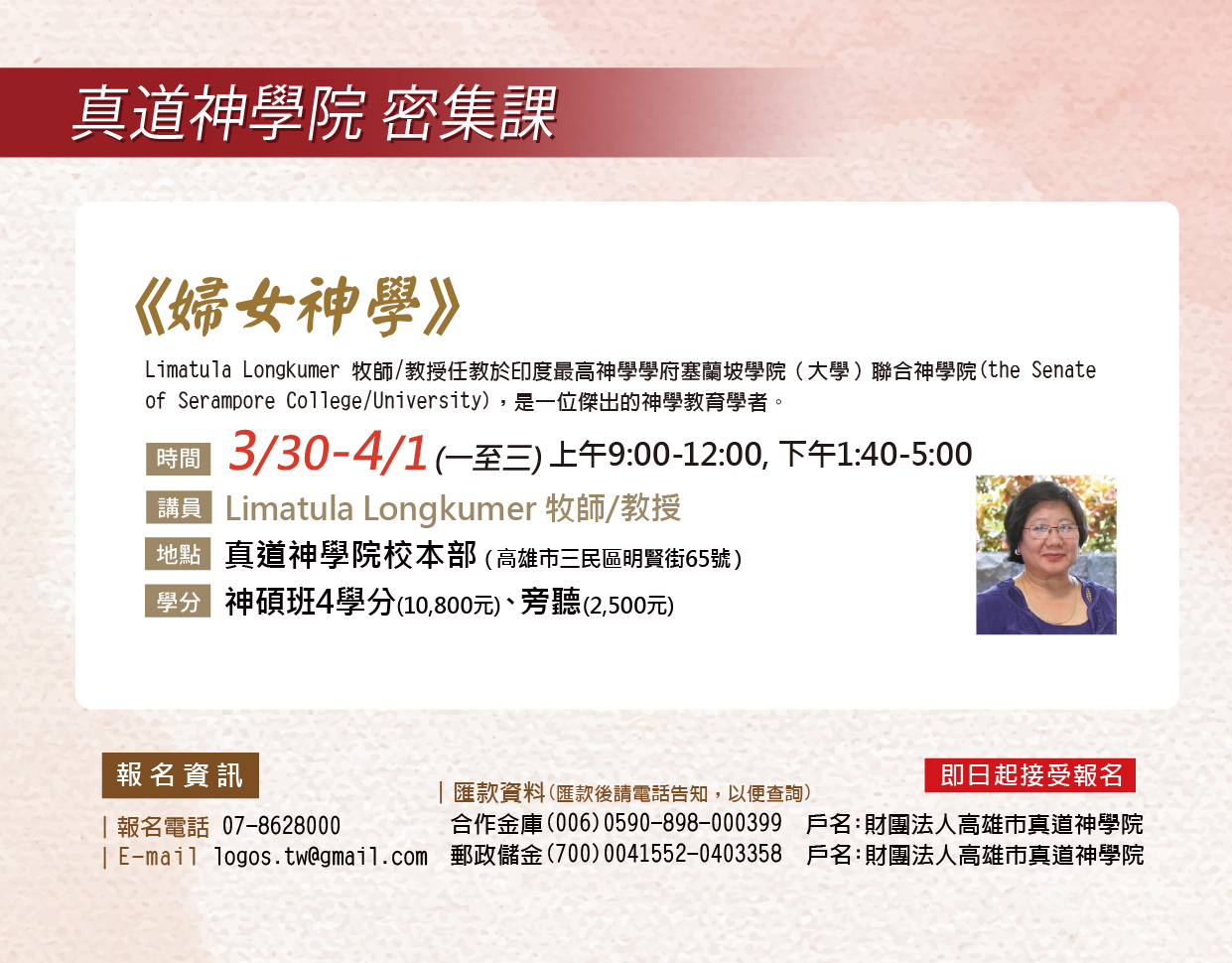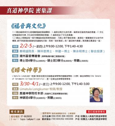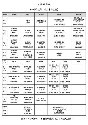 1. 2026年度招生簡章 2026 Admissions Brochure...(教務處-2026/01/15) 2. 真道神學院國際生入學申請書 International Student Admission Application Form...(教務處-2026/01/16) 3. 真道神學院入學申請書...(教務處-2026/01/14) 4. 2025學年度第二學期課表...(教務處-2025/12/03) 5. 2026年度行事曆...(教務處-2026/01/15) 6. 懇請安排2026年神學主日...(企劃處-2026/01/14) 7. 真道神學院遺產捐贈...(總務處-2025/05/05) more...