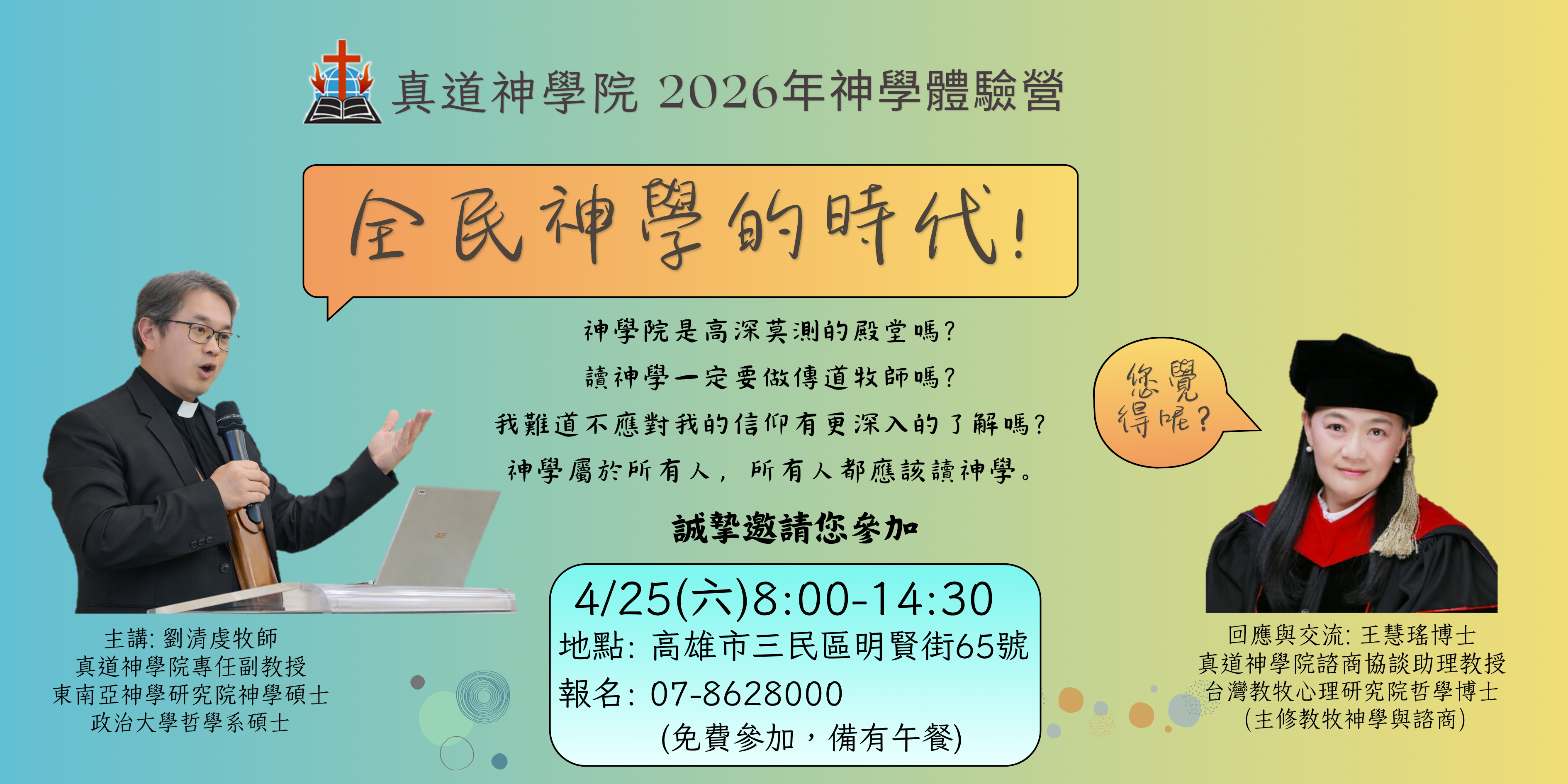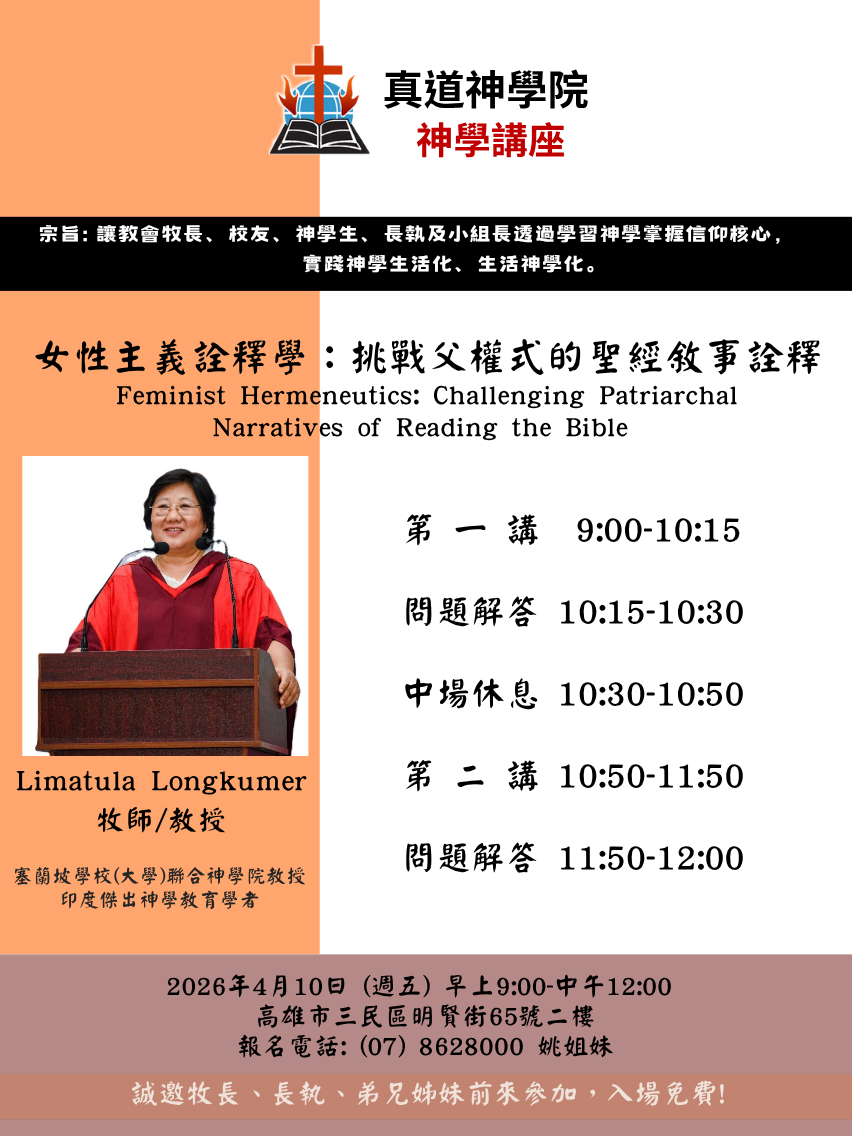 1. Brill西文電子書...(教務處-2026/03/10) 2. 最新院訊-第82期...(企劃處-2026/03/11) 3. 2026年4月真道神學院「神學講座」...(教務處-2026/04/02) 4. 2026年度招生簡章 2026 Admissions Brochure...(教務處-2026/01/15) 5. 真道神學院國際生入學申請書 International Student Admission Application Form...(教務處-2026/01/16) 6. 真道神學院入學申請書...(教務處-2026/01/14) 7. 2025學年度第二學期課表...(教務處-2025/12/03) 8. 2026年度行事曆...(教務處-2026/01/15) 9. 懇請安排2026年神學主日...(企劃處-2026/01/14) 10. 真道神學院遺產捐贈...(總務處-2025/05/05) more...