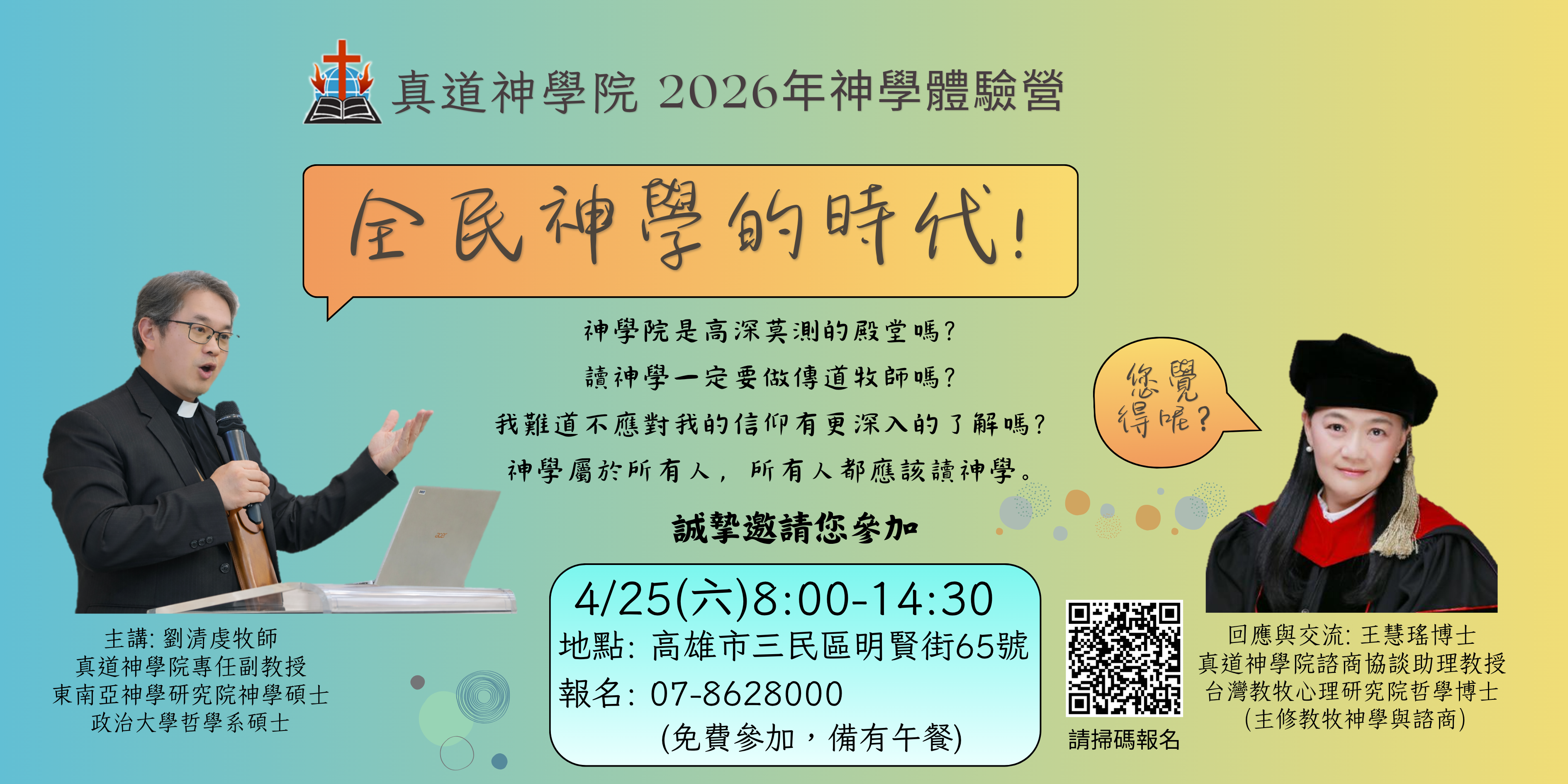 1. Brill西文電子書...(教務處-2026/03/10) 2. 最新院訊-第82期...(企劃處-2026/03/11) 3. 2026年度招生簡章 2026 Admissions Brochure...(教務處-2026/01/15) 4. 真道神學院國際生入學申請書 International Student Admission Application Form...(教務處-2026/01/16) 5. 真道神學院入學申請書...(教務處-2026/01/14) 6. 【真道院訊】揀選與呼召◎真道神學院牧育長╱陳嘉冕牧師...(企劃處-2026/04/20) 7. 2025學年度第二學期課表...(教務處-2025/12/03) 8. 2026年度行事曆...(教務處-2026/01/15) 9. 懇請安排2026年神學主日...(企劃處-2026/01/14) 10. 真道神學院遺產捐贈...(總務處-2025/05/05) more...