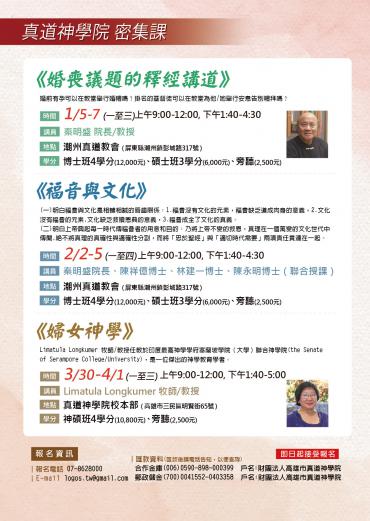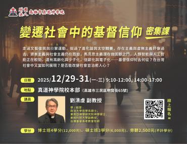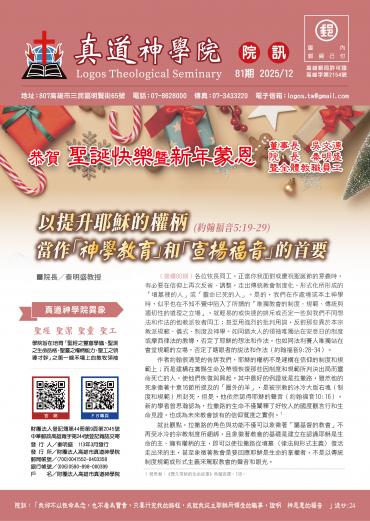 1. 懇請安排2025年神學主日...(企劃處-2024/09/10) 2. 最新院訊-第81期...(企劃處-2025/12/03) 3. 真道神學院遺產捐贈...(總務處-2025/05/05) 4. 真道神學院祝聖誕節快樂!!...(院長室-2025/12/22) 5. 2025學年度第二學期課表...(教務處-2025/12/03) 6. 2025年度行事曆...(教務處-2024/11/20) 7. 2025學年度新生錄取公告...(教務處-2025/08/12) 8. 相關收費明細...(教務處-2023/08/01) 9. 2025年度招生中...(教務處-2025/01/23) 10. DVD課程要求...(企劃處-2022/06/24) more...